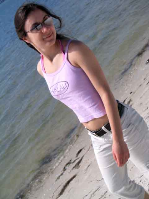 ... our model (Halali fiddler, Lissa) strolls on the beach in a Halali tank!